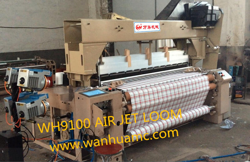 WH9100系列4喷电子多臂喷气织机,采用固定主喷嘴、摆动主喷嘴、双探纬器的引纬方式,稳定可靠的六连杆打纬机构。该机采用高强度的机架,采用超启动马达,配备先进而稳定的电控系统。采用能保持经纱恒张力的双后梁机构,选用超节能的引纬系列。因此,该机型具有操作简单、织造效率高等特点,是国内外织造用户的理想选择。 主要规格和技术参数: 1. 筘幅:190、210、230、250、280、340cm 2. 织造范围:短纤维:100S/1 ~5.8S/1 3. 纬纱选择:2喷、4喷、6喷自由选择 4. 马达:超启动马达。 5. 引纬:主喷嘴、辅喷嘴、异形钢筘,可选拉抻喷嘴。 6. 开口:凸轮开口2-10片综框,多臂开口综框2-16片综框。 7. 送经:电子送经,经盘Ø800MM 8. 卷取:机械卷取,可选电子卷取。 9. 打纬:曲柄式多筘座脚打纬机构 4连杆打纬(筘幅190 ~280cm以下) 6连杆打纬(筘幅280 ~360cm)